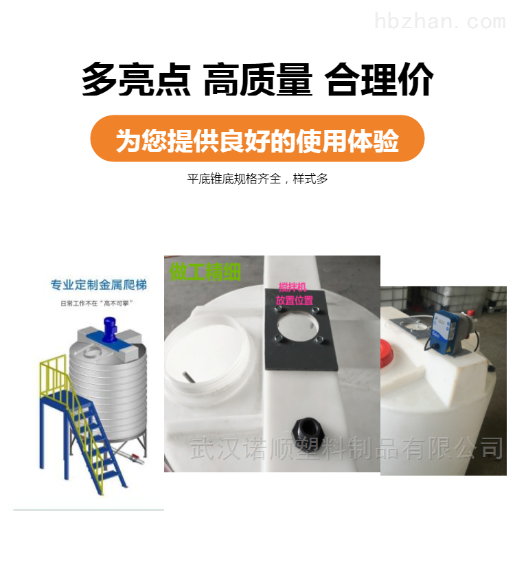 结构设计:通常采用锥形底部+机械搅拌装置,加速药剂溶解并防止沉淀;桶体材质多为PE塑料(耐酸碱腐蚀)或不锈钢(耐高温高压),配备液位计、进出水口及控制阀门。